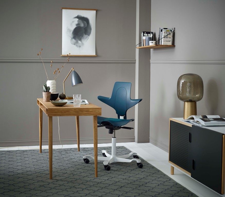 Mit dem HAG Capisco Puls wechselt man gerne zwischen erhöhtem Sitzen und Stehen an einem höhenverstellbaren Arbeitsplatz.