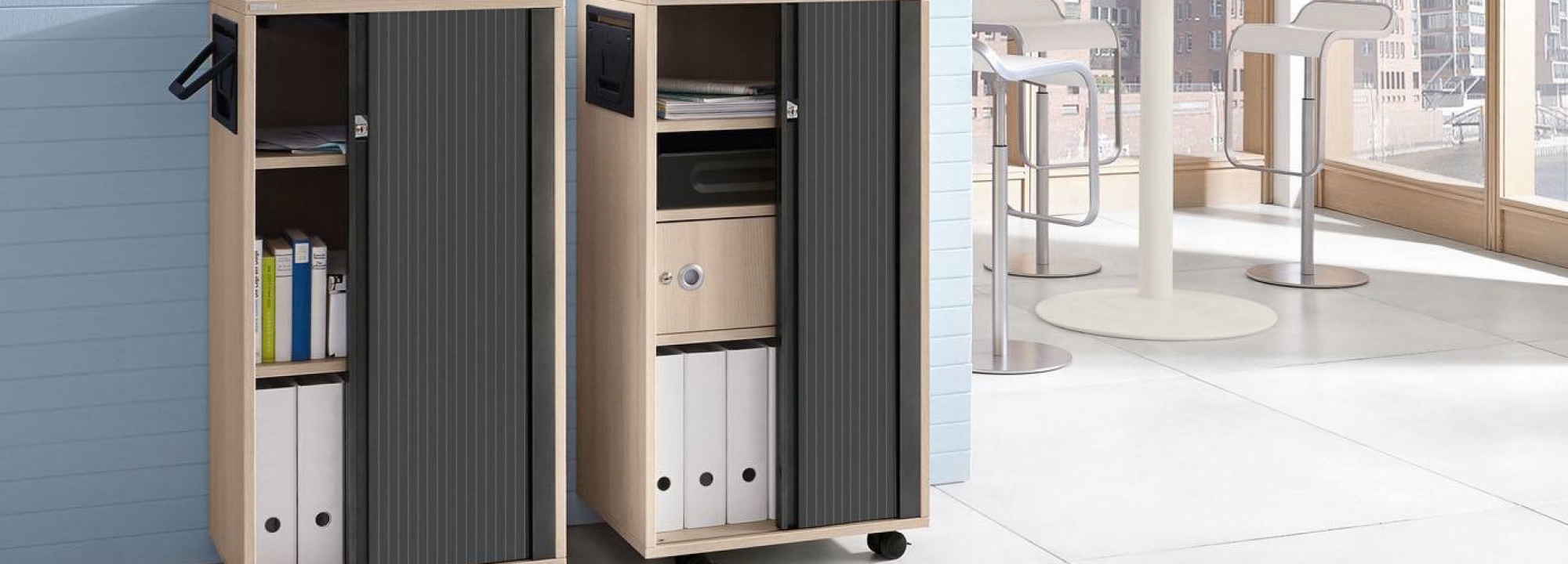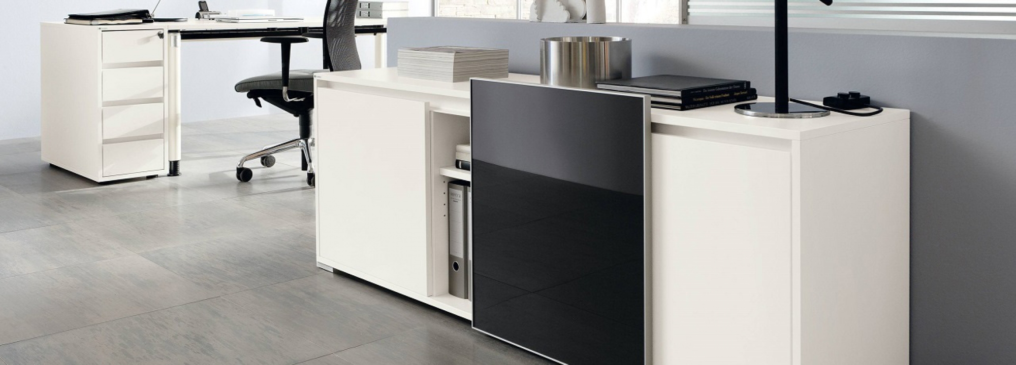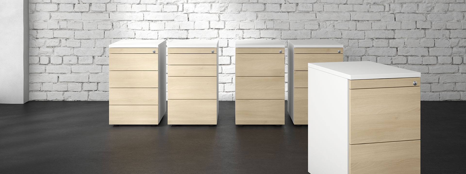 Rollcontainer sind unter dem Schreibtisch positioniert. Sie sorgen für Stauraum und perfekte Ordnung. Ob Materialschublade, Hängeregister oder Schublade, sie sorgen für einen aufgeräumten Arbeitsplatz!